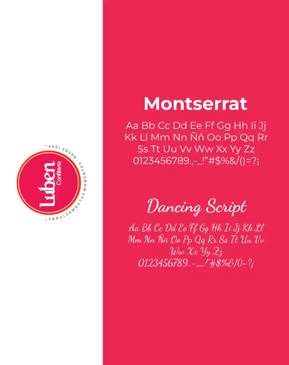 Se utilizó una combinación tipográfica entre Montserrat y Dancing Script, buscando un equilibrio entre modernidad y calidez artesanal. Esta fusión transmite cercanía y elegancia, combinando la legibilidad contemporánea de Montserrat con la personalidad expresiva y artesanal de Dancing Script, reflejando así el espíritu dulce y creativo de la marca.